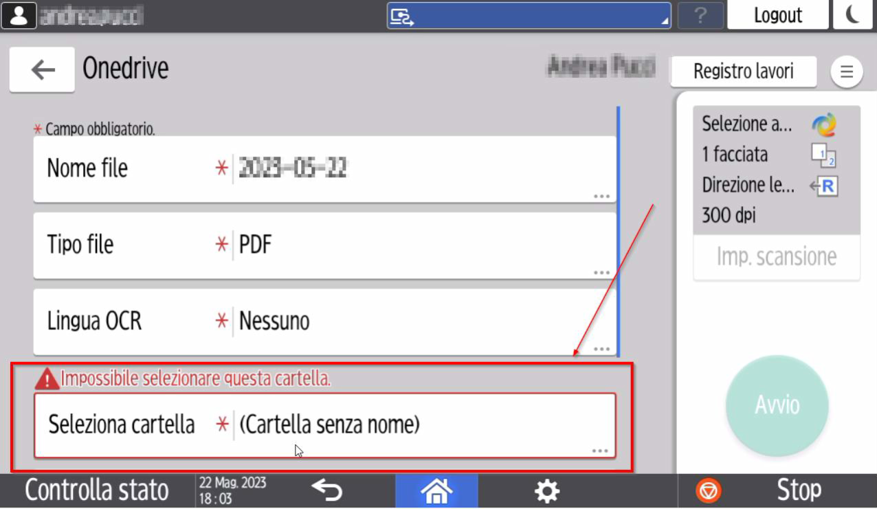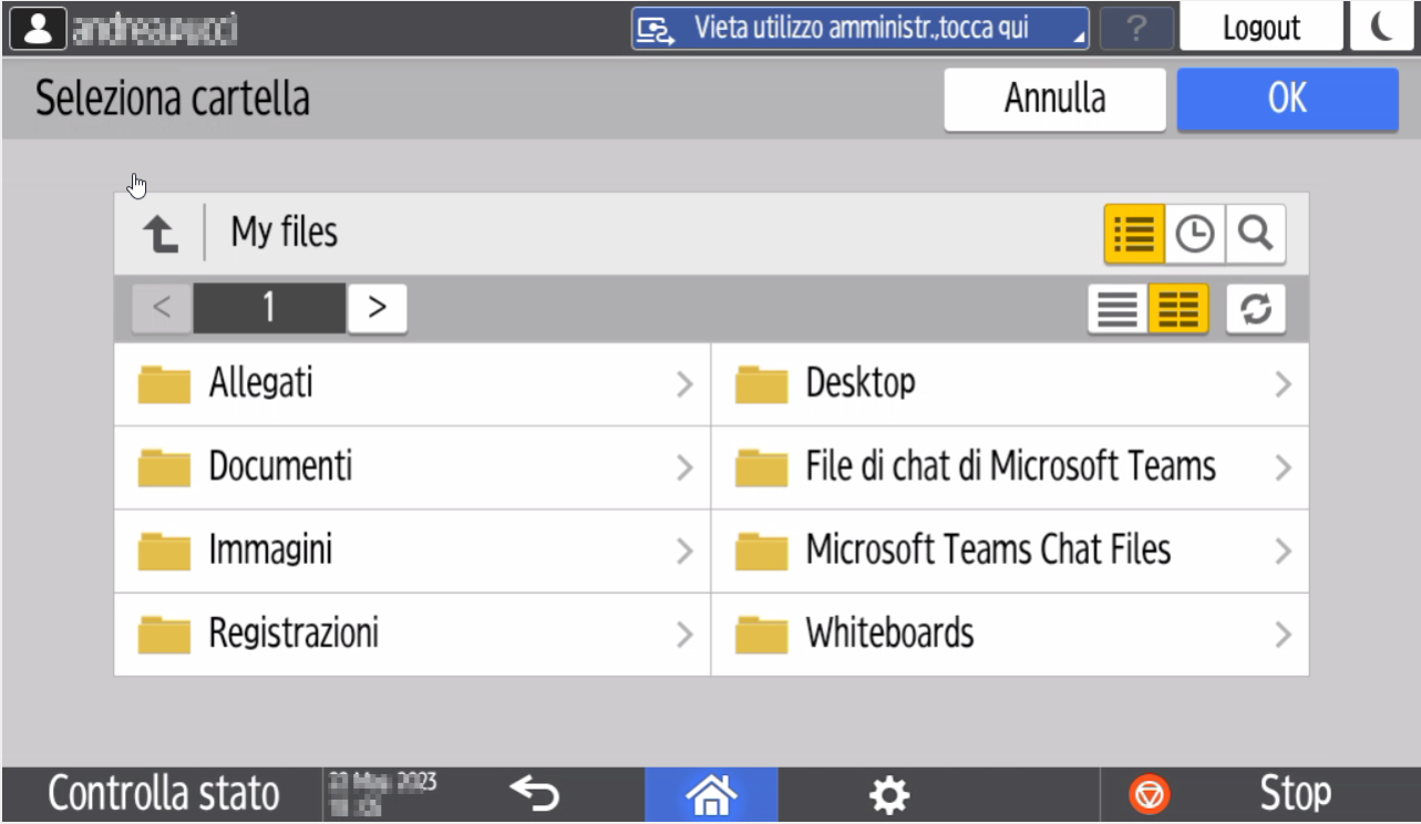 Una volta autenticati alla multifunzione selezionare il tasto OneDrive dalla schermata principale.